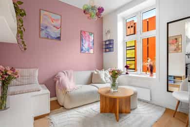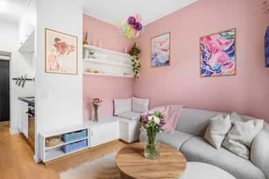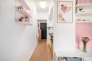 Lampe i stua, rosa hylle ved kjøkkenet følger ikke med kjøpet.
