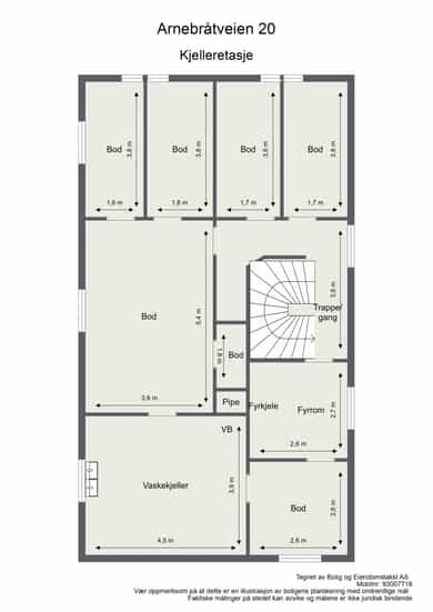 Boligen inneholder: Trapperom, fyrrom, vaskerom, 6 boder, 2 trapperom, gang, 4 stuer, 2 bad, 2 kjøkken, kott, 5 soverom, loft og lagringsloft