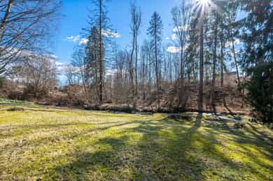 Tomt med busker, plen, trær, støttemur, dukkestue, gjerde m.m.