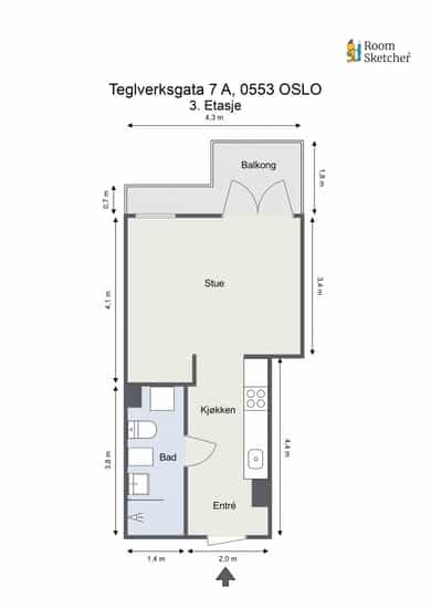 3. Etasje: Entré, bad, stue/kjøkken/sov Kjeller: Bod Det gjøres særskilt oppmerksom på at bod som er medtatt som BRA-e og i totalt BRA ligger på fellesareal, men disponeres av denne leiligheten.