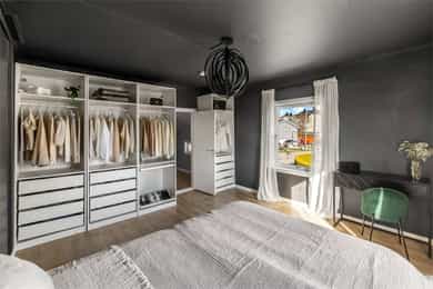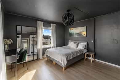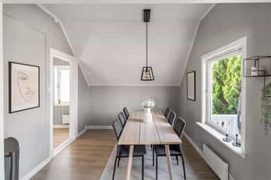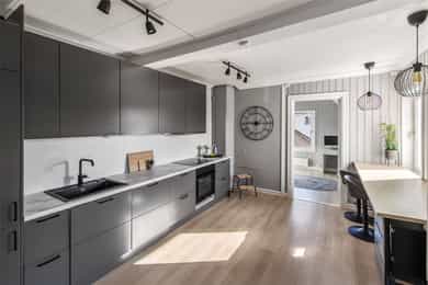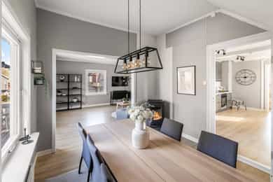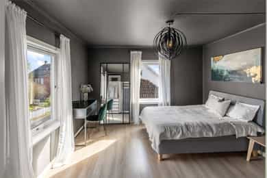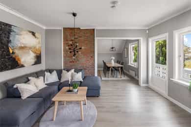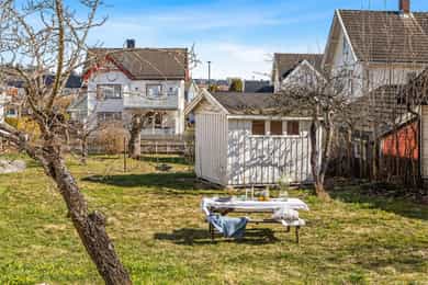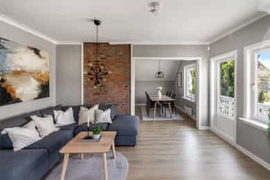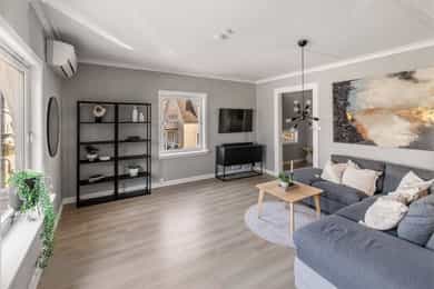 St Olavs gate 47B er en stilfull, luftig og velholdt halvpart av en horisontaldelt tomannsbolig. Beliggenheten er sentral og attraktiv, med nærhet til kyststi, matbutikk og busstopp, samt kort vei til skoler og barnehager. Videre kan eiendommen skilte med inngjerdet, solrik felleshage, parkering i garasje og egen, vestvendt balkong på ca. 8 kvm med gode solforhold og fint, lokalt utsyn. Boligen ligger i 2. etasje, og oppholdsrommene er stilfullt oppgradert i perioden 2021 til 2025. Farge- og materialvalgene er tidsmessige, og planløsningen er god. Stuen og spisestuen ligger i dels åpen løsning og byr på møbleringsfrihet og varmepumpe, og på et lekkert Epoq-kjøkken fra 2021 er det integrerte hvitevarer. Videre er det et bad/wc/vaskerom og to pene soverom, hvorav ett har garderobeløsning