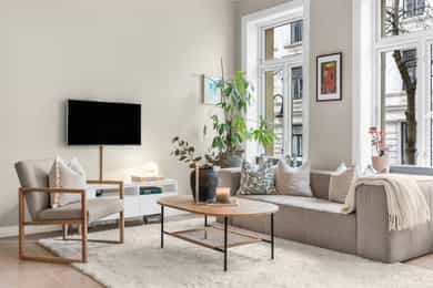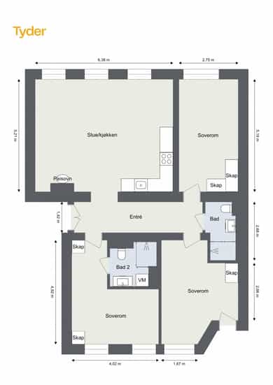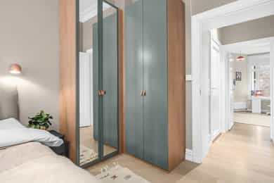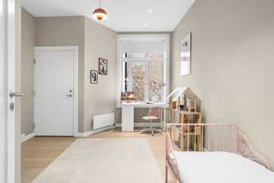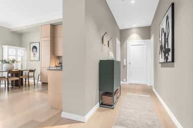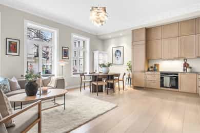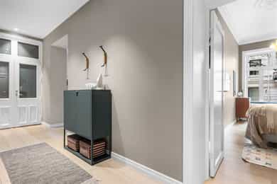 1.etasje, 100 m² BRA-I: Bad, Bad 2, Entré, Stue/kjøkken, Tre soverom Leiligheten disponerer to boder hvorav én bod i kjeller på ca. 6 m² og én bod i baktrapp på ca. 3 m². Entré/gang: Høy 1.etg med egen inngang fra felles portrom. Brann- og lydklassifisert entrédører og porttelefon fra 2019. Mulighet for å åpne begge dørene. I leiligheten blir du møtt av en innbydende entré/gang. God takhøyde med downlights i himlingen. Stue/kjøkken: Stor og lys stue med åpen kjøkkenløsning. Stue og kjøkken danner sammen et sosialt oppholdsrom på ca. 33 m² med nye klassiske vinduer i 2019, god takhøyde, rosett og stukkatur. Effektiv vedovn med glassdør fra ThermaTech som gir god atmosfære og varme. Svært god plass til spisebord og sittegruppe. Fra stuen ser man utelukkende klassiske bygg i nabolaget. Stilren og moderne kjøkkeninnredning fra Sigdal med integrerte hvitevarer fra Siemens og laminat benkeplate. Armatur fra Tapwell med uttrekksfunksjon. Bad I Delikat flislagt bad nr. 1 renovert i 2019 med Norfloor Timeless-serien (Calacatta 80x240cm) flis på vegg og 80x80cm flis på gulv. Vegghengt wc, vegghengt speil og servant med skuffer. Fukt- og bryterstyrt avtrekksvifte i taket. Stor og deilig dusjnisje med glassdør, tile-insert linjesluk og innebygget takdusj, hånddusj og armatur fra Tapwell. Bad II Delikat flislagt bad nr. 2 renovert i 2019 med påkostede fliser fra Norfloor Timeless-serien (Calacatta 80x240cm) på vegg og 80x80cm flis på gulv. Spotter i taket og varme i gulv. Avtrekksvifte i taket. Vegghengt wc, dusjhjørne med glassdører, tile-insert linjesluk og innebygget takdusj og hånddusj fra Tapwell. Baderomsinnredning med store skuffer og armatur fra Tapwell samt vegghengt speil. Opplegg for vaskemaskin og tørketrommel. Hovedsoverom Hovedsoverom på ca. 14 m² med god plass til dobbeltseng, nattbord og garderobeskap. Snekkerbygget hjørnegarderobe. Rommet ligger vegg-i-vegg med bad nr. 1. Flott takrosett og original stukkatur på hovedsoverommet. Soverom II Soverom II på ca. 14 m² med adkomst til eget bad/vaskerom. Mulighet for garderobe på nesten 5 meter langs veggen til høyre. Rommet vender mot bakgården, har god plass til dobbeltseng og egner seg også godt som hovedsoverom. Soverom III Soverom III på ca. 13 m² med god plass til seng, garderobeskap og skrivebord. Praktisk nettverksskap, som skjuler ruter og annet utstyr (Fiber-nett). Rommet vender mot bakgården og har dør til baktrappen.