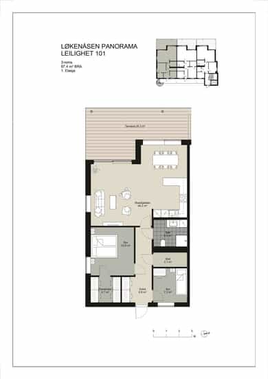BRA-i: 87 kvm. Entre, stue, kjøkken, bad, 2 soverom, omkledningsrom