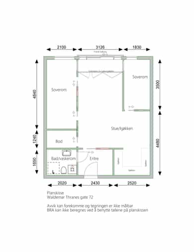 BRA-i: 59 kvm. Entrè, stue/kjøkken, bad/vaskerom, 2 soverom og bod.