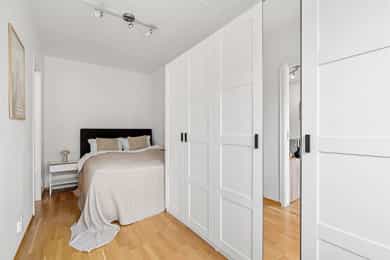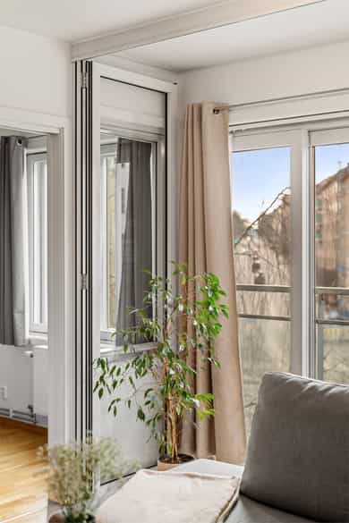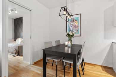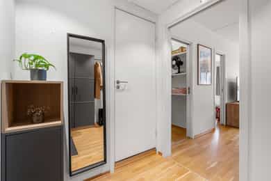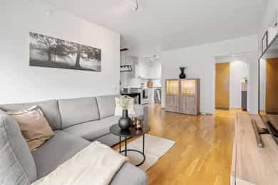 Entrè | Velkommen inn! Entréen er innbydende og gir et godt førsteinntrykk av boligen. Her er det plass til garderobeløsning for yttertøy og sko. Leiligheten har et gjennomgående moderne preg med lyse overflater og parkett på gulv. Stue | Lys og innbydende stue med store skyvbare terrassedører som slipper inn rikelig med naturlig lys. Dørene kan skyves i begge retninger og åpnes helt opp mot fransk balkong med rekkverk, noe som gir en herlig følelse av å sitte ute – som en liten balkong eller vinterhage, perfekt store deler av året. Det er montert en praktisk foldedør ca. 90 cm inn i stuen som kan trekkes helt igjen, og gir fleksible løsninger for rominndeling, skjerming eller ekstra privatliv ved behov. Stuen har gode møbleringsmuligheter og en luftig atmosfære som inviterer til både avslapning og sosiale sammenkomster. Kjøkken |Stilrent og moderne kjøkken med glatte fronter og laminat benkeplate som gir et tidløst og lettstelt uttrykk. Praktisk løsning med elektrisk vannstopp integrert i benken. Kjøkkenet leveres uten integrerte hvitevarer, noe som gir ny eier full frihet til å velge hvitevarer etter egen smak og behov. Kjøkkenhette med avtrekk til felles anlegg (nytt spjeld i 2022/2023). Bad | Delikat og funksjonelt bad med flislagte vegger og behagelig gulvvarme som gir god komfort året rundt. Badet er utstyrt med moderne innredning med nedfelt servant, veggmontert toalett og dusjløsning med vegger i hjørne. Det er også opplegg for vaskemaskin. God ventilasjon bidrar til et friskt og behagelig inneklima. Soverom | Leiligheten har 2 gode soverom. Begge har plass til dobbeltseng, nattbord og garderobeløsning. Rommene egner seg godt som hovedsoverom, barnerom, gjesterom eller hjemmekontor etter behov. ___________________________ Innvendige overflater | Parkett på gulv og glattmalte vegger og himlinger. For det meste malt dekke i himling. I gangen er det himlingsplater Innvendige dører er malte glatte dører. Med unntak av inn til badet er det innvendige skyvedører Tekniske innstallasjoner | Vannrør inne i leiligheten er rør i rør plast. Fordelerskap med stoppekran på badet. Foruten oppvaskbenk eller under badeskap var ikke avløpsrør synlig. Naturlig ventilasjon via to ventiler i vegg bak radiator på begge soverommene Fjernvarme som gir varmt vann til vannbåren varme Sentralt varmtvannstank Vannbåren varme til tre veggmonterte radiatorer Elektrisk anlegg med automatsikringer og kursfortegnelse.