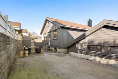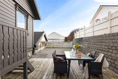 Sørvestvendt terrasseplatting på baksiden av huset.