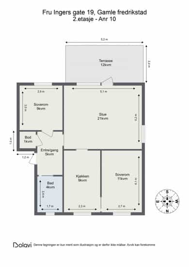 BRA-i: 64 kvm. - Entré, bad, to soverom, stue og kjøkken. Innvendig bod i tilknytning til entréen.