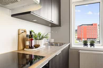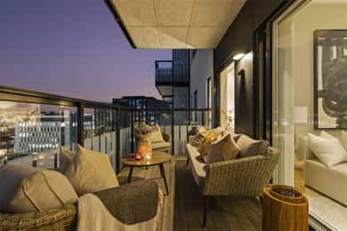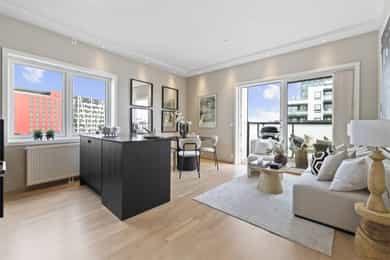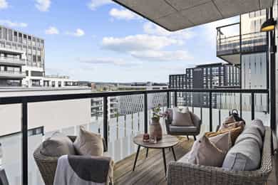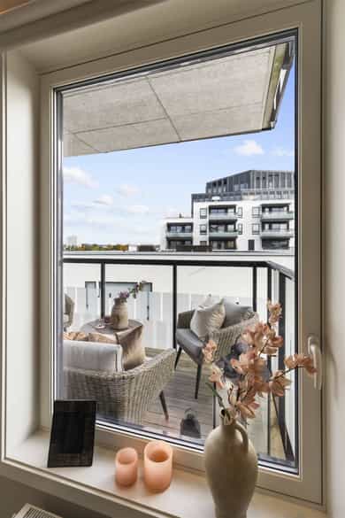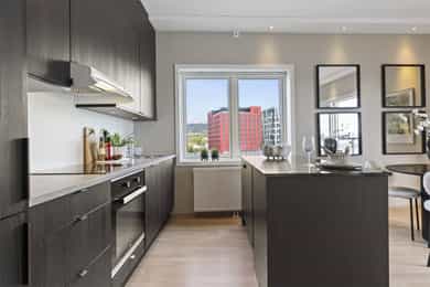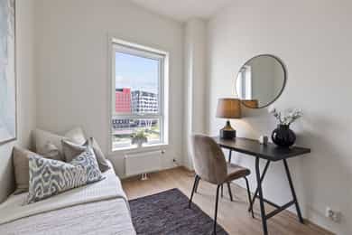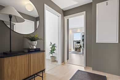 Stue: Lys og innbydende stue med god plass til både sofagruppe og annet møblement. Store vindusflater fra flere retninger slipper inn rikelig med naturlig lys og gir rommet en luftig og behagelig atmosfære. Balansert ventilasjon sørger for et sunt og behagelig inneklima året rundt. Via stuen er det direkte adkomst til skap / innvendig bod med gode oppbevarigsmuligheter. Balkong: Fra stuen er det direkte utgang til en romslig og solrik balkong på hele 9 kvm. Den østvendte beliggenheten gir gode solforhold på morgenen og formiddagen – perfekt for frokost i solen. Balkongen fungerer som en naturlig forlengelse av boligen i sommerhalvåret, med god plass til både sittegruppe og beplantning. Utsikten over de trivelige fellesområdene bidrar til en avslappende og luftig følelse. Kjøkken: Kjøkkenet er åpent mot stuen og gir en moderne og sosial planløsning – perfekt for deg som liker å lage mat og samtidig være en del av selskapet. Den stilrene innredningen fra byggeåret har profilerte fronter, laminat benkeplate og overskap med takhøy foring for optimal lagringsplass. Kjøkkenet er godt utstyrt med integrert induksjonstopp, stekeovn og kombinert kjøl-/fryseskap. Over kokeplassen er det montert ventilator for god luftkvalitet. I 2024 ble det montert en elegant benkeplate i sten (nero assoluto - svart granitt) på kjøkkenøya, et lekkert og funksjonelt blikkfang som også skaper en naturlig sonedeling mellom kjøkken og stue. I tilknytning kjøkkenet er det også rom for spisebord. Bad: Delikat og moderne baderom fra byggeåret, innredet med dusjhjørne, vegghengt toalett, servantskap med skuffer og speil med integrert belysning. Praktisk opplegg for vaskemaskin og tørketrommel gjør hverdagen enklere. Rommet er helfliset med varme i gulvet, flislagte vegger og nedfelt himling med downlights for et gjennomført og behagelig uttrykk Soverom 1: Romslig soverom meg god plass til dobbelt seng, nattbord og kommodeplass. I tillegg er det et omkledningsrom med skyvedør som i dag brukes som i garderobeplass. Soverom 2: Lunt og hyggelig soverom med god plass til dobbeltseng og nattbord. Videre er det mulighet for garderobeskap / kommode for oppbevaring av klær og personlige eiendeler. Entré: Lys og innbydende entré med en enkel og praktisk utforming. Her møtes du av en behagelig atmosfære og god plass til oppheng av yttertøy og oppbevaring av sko. De mørkmalte overflatene gir et ryddig og velkomment førsteinntrykk, og legger til rette for en god start på hver dag.