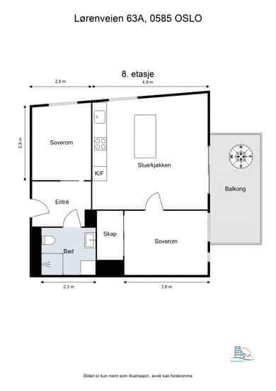 BRA-i: 55 kvm. Entré, 2 soverom, bad, og stue/kjøkken