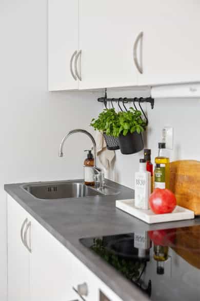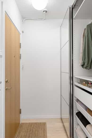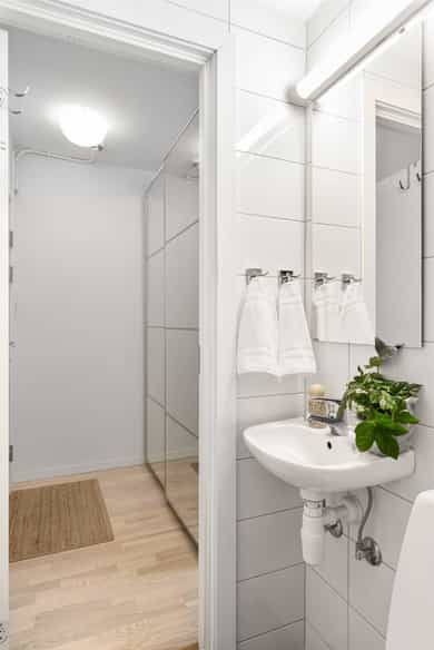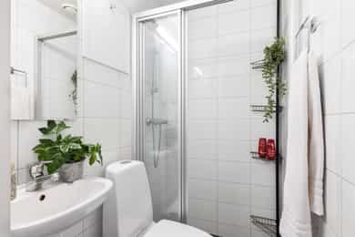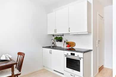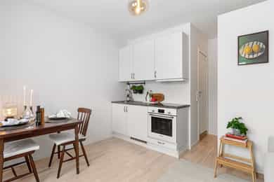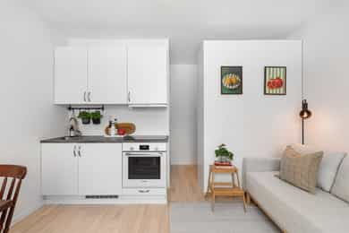 4. etasje: Borettslaget har heis og trapp opp til leiligheten. Gjennom inngangsdøren befinner leiligheten seg på 17 kvm. Her har man plass til seng, egen spisegruppe/sittegruppe, garderobeskap og leiligheten har eget flislagt bad. Entré: Åpen entré med god plass til oppbevaring av ytterklær og sko i skyvedørsgarderobe. Det er installert callinganlegg med døråpner. Bad / wc: Delikat, flislagt baderom fra 2014 med behagelig gulvvarme. Badet er innredet med WC, dusjplass med dusjvegg og servant med ettgreps blandebatteri. Kjøkken: Kjøkkenet er praktisk utformet og tilbyr rikelig med både skap- og benkeplass. Kjøkkenet har glatt laminert kjøkkeninnredning, laminat benkeplate og kum med ettgreps blandebatteri. Det er kullfiltervifte over stekesonen. Kjøkkenet har integrert koketopp/ovn og kjøleskap. Stue: Lys og arealeffektiv stue som er enkel å møblere med både sofa- og TV-løsning. Det store vinduet slipper inn rikelig med naturlig lys, og rommet har gode oppbevaringsmuligheter gjennom en romslig skyvedørsgarderobe. Bod: Leiligheten disponerer en bod i kjeller på 1,35 m², merket med 402. Overflater: Gulv: Parkett på gulv. Vegger: Malte flater. Himling: Malte flater. Vinduer: 2-lags press glass, prod. 2016. VVS-installasjoner, generelt (ventilasjon, varme og sanitær): Baderom med mekanisk avtrekk i himling. Fjernvarme tilknyttet radiator og elektriske varmekabler på badet, vannrør av rør-i-rør og avløpsrør av plast. Elkraft: Sikringsskap med automatsikringer plassert i trappeoppgang Diverse: Internett (Fibernett). Porttelefon. Standard Boligen fremstår som pen med praktisk og arealeffektiv planløsning. Tilstandsrapport for boligen er vedlagt salgsoppgaven. Se denne for nærmere informasjon om tilstandsgrad.