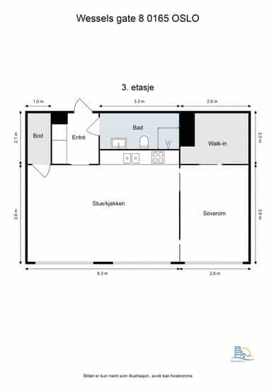 Leiligheten ligger i 3. etasje og inneholder entré, bad, bod, walk-in closet, soverom, kjøkken og stue. I tillegg disponerer leiligheten en kjellerbod på ca. 5,4 kvm.