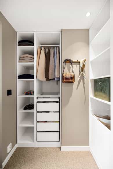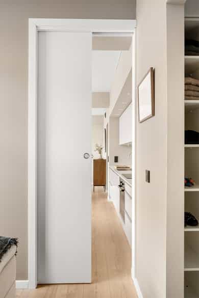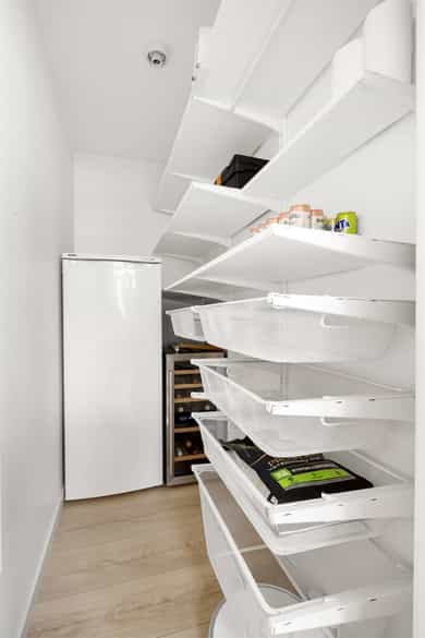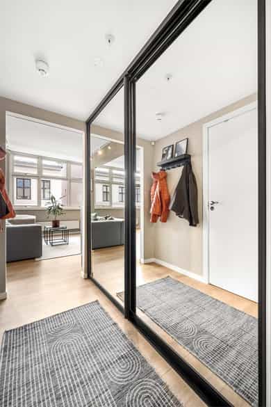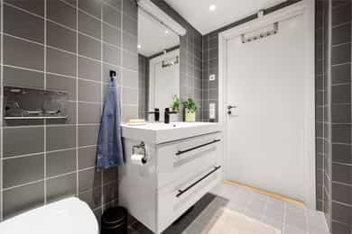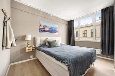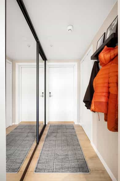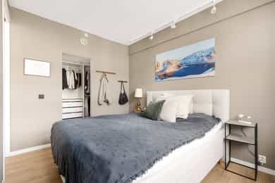 Entré: Velkommen inn! Her får du et umiddelbart godt førsteinntrykk. I gangen er det innholdsrik skyvedørsgarderobe for oppbevaring av sko og yttertøy. Garderobeskapet ble montert i 2023. Åpen kjøkken- og stueløsning: Moderne og stilrent HTH-kjøkken. Lys innredning med glatte fronter, fliser på vegg over kjøkkenbenk og benkeplate i laminat. Flisene ble lagt i 2021. Integrerte hvitevarer bestående av platetopp, stekeovn, oppvaskmaskin og kjøleskuffer. Avtrekk over stekesonen. Det er godt med lagringsplass i både skap og skuffer, samt god plass til matlaging. Stuen er lys og innbydende med store vindusflater, stilrene overflater og god takhøyde. Det er plass til stor sofagruppe med tilhørende sofabord og TV-møblement, samt spisebord ved kjøkkenet. Rommet har godt lysinnslipp med store vindusflater langs hele den ene veggen og god takhøyde på 2,75 meter. Dette gir en luftig og svært god romfølelse. Det er montert persienner som både kan senkes fra toppen eller heves nedenfra som bidrar til å redusere sollys og skjerme for innsyn. Overflatene er pusset opp i senere tid, og består av pen enstavs laminat og veggene er holdt i lune, tidsriktige farger. Selger opplyser at stuen ble malt i 2022. Det ble fjernet dørkarmer og laget listefri åpning mellom gang/stue og soverom/garderobe i 2025. Fra stuen er det adkomst til en innvendig bod. Boden er utstyrt med hyller og har godt med lagringsplass. Den store hylleseksjonen medfølger. Soverom: Delikat soverom av god størrelse. På rommet er det rikelig med areal til dobbeltseng med tilhørende nattbord. Rommet har store vindusflater som sikrer godt med lys og luft. Soverommet er malt i en behagelig fargetone som passer godt med interiøret for øvrig. Fra soverommet er det adkomst til eget walk-in closet (bod). Her er det rikelig med lagringsplass i åpen garderobeløsning. Bad: Romslig og funksjonelt bad med flislagte overflater, innfelte downlights og elektrisk gulvvarme. Badet er utstyrt med vegghengt toalett, dusjhjørne med svingbare glassdører og baderomsinnredning fra Blum med skuffer, nedfelt servant og speil med belysning. Det er opplegg for vaskemaskin. Mekanisk avtrekk. Overflater: Gulv: Enstavs laminat, teppe (i walk-in closet) og flislagt gulv på badet. Selger opplyser at det ble fjernet dørkarmer og laget listefri åpning mellom gang/stue og soverom/garderobe i 2025. Vegger: Malte plater og betong. Flislagte vegger på badet. Hele leiligheten (med unntak av bad, gang og bod) ble malt i 2022 og gangen ble malt i 2025. Himling: Himlinger med malt betong. Takhøyden i stuen ble målt til 2,75 meter.