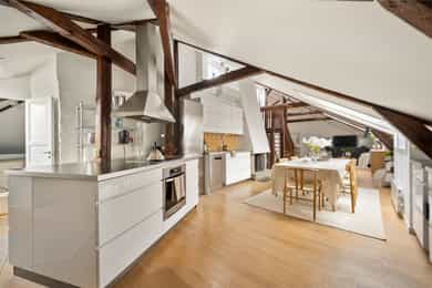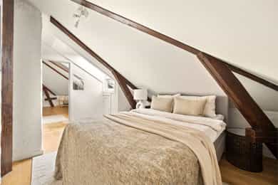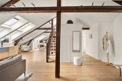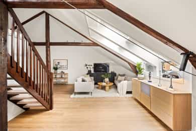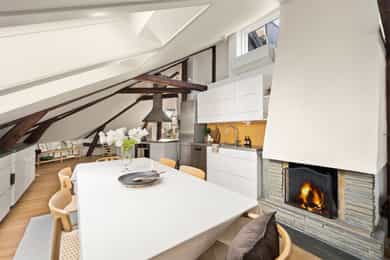 Stilfull, gjennomført og stor 4-r toppleilighet med solrik takterrasse - GUA 134 kvm - Parkeringsplass med lader - Peis