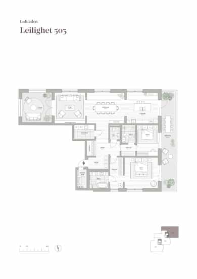 Om prosjektet: Velkommen til Enfiladen - ditt nye hjem på Frogner. Her utvikles 19 store, unike leiligheter samt en byvilla i øvre prisklasse. I Erling Skjalgssons gate 25 vil det gamle «Frognerhjemmet» erstattes av et nytt og unikt boligbygg som forener moderne kvaliteter med klassiske og ærverdige omgivelser. Boligene ligger skjermet og tilbaketrukket mellom kvartalsbebyggelsen fra 1900-tallet i sør og den historiske Schafteløkken i nord. De romslige leilighetene er utviklet etter det tradisjonelle prinsippet med «enfilader», der rom på rom ligger som perler på en snor - slik man kjenner fra de klassiske «Frognerleilighetene». Her får du et rom for enhver anledning – enten det er til store selskap, et eget rom til flygelet, et bibliotek eller et TV-rom hvor man kan trekke seg tilbake. Valget er ditt. Leilighetene i Enfilanden har private terrasser, lune loggiaer, rause rom, parkeringsplasser og heisadkomst – alt for at du skal føle deg komfortabel og hjemme. Om leilighet: Leilighet 503 er en praktfull endeleilighet med lysinnslipp fra alle himmelretninger. Leiligheten har 3-rom på rad og er utviklet etter det tradisjonelle prinsippet med «enfilader», der rom på rom ligger som perler på en snor, slik man kjenner fra de klassiske «Frognerleilighetene». Leiligheten har en praktisk utforming med en romslig hall/entré, stue, spisestue og kjøkken på rad, to fullverdige bad, separat vaskerom, gjestetoalett, to soverom, loggia og terrasse. Leilighetene i Enfiladen har tilgang til fasiliteter som treningsrom og spa-avdeling, og har enkel adkomst via underjordisk garasjeanlegg, som gjør at man kan gå tørrskodd fra bilen til leiligheten. Den sofistikerte fargepaletten, og de nøye utvalgte materialene, skaper en harmonisk balanse mellom det moderne og ærverdige, og gir en følelse av eleganse og ro.