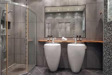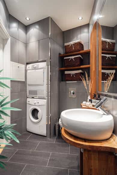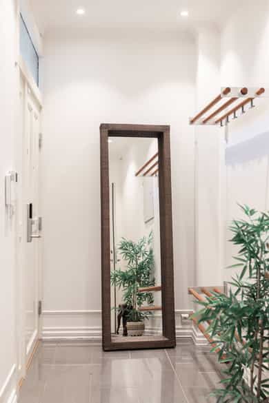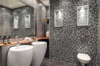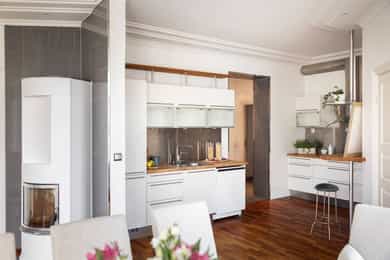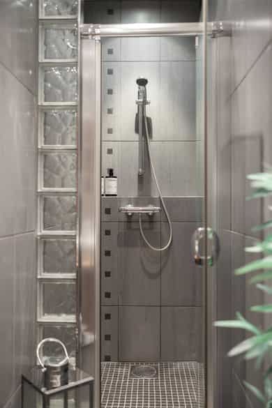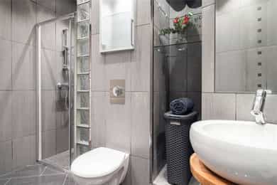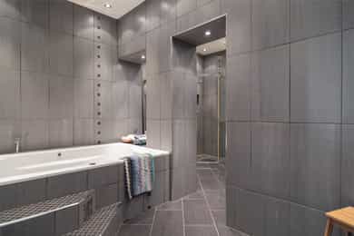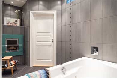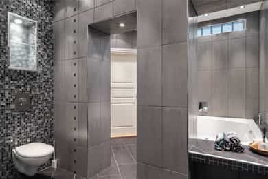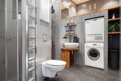 Kjøkken: Pent HTH-kjøkken med glatte fronter og benkeplate av heltre. Nedfelt vaskekum i rustfritt stål. Kjøkkenet har integrerte hvitevarer fra AEG som består av mikrobølgeovn, komfyr, keramisk platetopp og kjøleskap med fryser. Frittstående oppvaskmaskin fra Avant. Det er kjøkkenventilator med avtrekk ut. Bad 1: Lekkert, flislagt baderom i tilknytning til hovedsoverommet. Badet har downlights i himling og varme i gulv. Innredningen består av to søyleservanter, speil, veggmontert toalett, boblebad og dusjhjørne med skyvedør i glass. Alle badene har eksklusive IlbagnoAlessi-servanter, designet av Stefano Giovannoni. Elektrisk styrt avtrekksvifte. Bad 2: Moderne, flislagt baderom med downlights i himling og varme i gulv. Badet består av skålservant, speil, vegghengt toalett og dusjhjørne med glassdør. Det er opplegg for vaskemaskin og tørketrommel i egen nisje. Badet har elektrisk styrt avtrekksvifte. HYBELDEL Kjøkken: Praktisk kjøkkenmodul i rustfritt stål med overskap med glatte fronter. Kjøkkenet er innredet med vaskekum, integrert kjøleskap, platetopp og ventilator med avtrekk ut. Bad: Flislagt baderom med downlights i himling og varme i gulv. Badet er innredet med skålservant, speil, veggmontert toalett og dusjnisje med glassdør og glassbyggerstein. På badet er det opplegg for vaskemaskin. Elektrisk styrt avtrekksvifte i himling. Innvendige overflater: - Gulv: fliser i entré og gang, og 3-stavs parkett i øvrige rom. - Vegger: malte flater og malt mur, dels med strie. - Himling: malte flater. Innvendige dører: Malte fyllingsdører, dobbelfløyet dør til soverom ved stue. Takhøyden i stuen er målt til 2,87 meter.