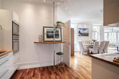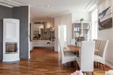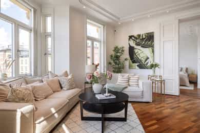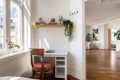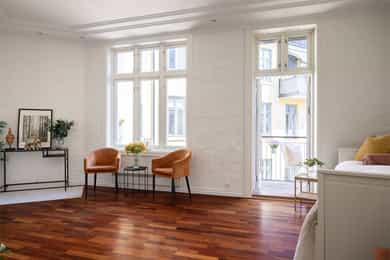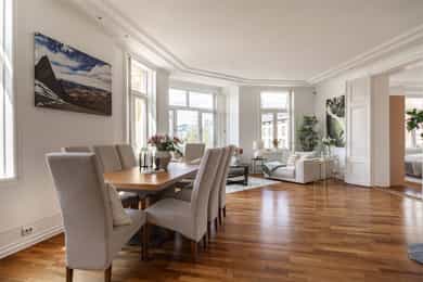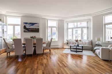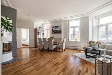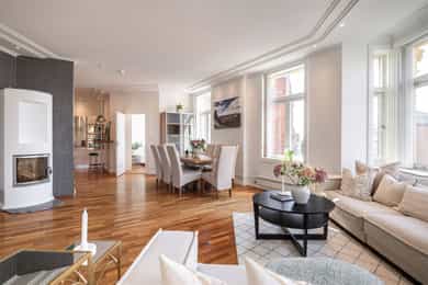 Lys og innbydende klassisk 4-roms hjørneleilighet på 134m². Balkong, hybeldel og 3 bad. God takhøyde. Peis. Mulig p-leie