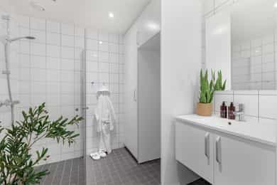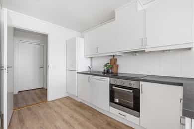 3. etasje: Gang Velkommen inn i en lys og trivelig gang med plass til yttertøy og sko. Soverom Leiligheten har to soverom. Hovedsoverommet er romslig med god plass til seng og oppbevaring, mens det andre soverommet passer utmerket som barnerom, gjesterom eller kontor. Kjøkken Kjøkken med slette fronter og benkeplate. Mot stuen er det etablert en koselig spiseplass som naturlig binder rommene sammen. Stue Stue og kjøkken har i dag en åpen løsning som gir en luftig og innbydende romfølelse. Her er det plass til sofa, bord og TV-møbler. Fra stuen er det utgang til en hyggelig uteplass – perfekt for avslapning og hyggelige stunder. Bad Badet er helfliset fra gulv til tak og innredet med servant, vegghengt toalett og dusj. Det er også avløp for vaskemaskin samt ventilasjon i himlingen. Mellomgang Praktisk mellomgang. Utvendig bod Praktisk utvendig bod som gir ekstra oppbevaringsplass.