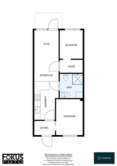 BRA-i: 52 kvm. Gang, 2 soverom, kjøkken, stue, bad, mellomgang