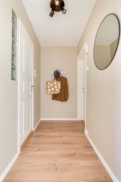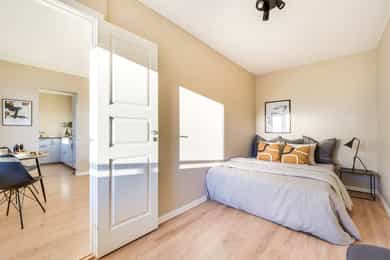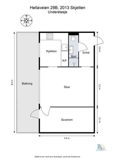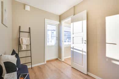 Entré Lystmalt entré med plass til å henge fra seg ytterklær og sko. Kjøkken Stilrent og moderne kjøkken fra 2022 med glatte fronter og laminert benkeplate. Kjøkkenet er funksjonelt utformet med nedfelt vaskekum, integrerte hvitevarer og montert vannstoppsystem – godt tilrettelagt for både hverdagsbruk og matlaging. Stue Lys og romslig stue med store vindusflater som slipper inn rikelig med naturlig dagslys og skaper en luftig romfølelse. Stuen har fleksible møbleringsmuligheter og kan enkelt innredes med sofagruppe, TV-møblement og spiseplass. Soverom Lunt og behagelig soverom med god plass til dobbeltseng, nattbord og garderobeløsning. Fra soverommet er det direkte utgang til boligens romslige balkong på hele 16 kvm – et flott uterom for avslapning og sosiale stunder. Bad Flislagt bad med elektrisk gulvvarme. Innredningen består av vegghengt wc, servant nedfelt i innredning og dusjhjørne med forheng. Det er mekanisk ventilasjon i rommet. Innvendig: Himlinger med malt betong. Vegger med malte plater. Gulv med laminat. Takhøyden i stuen ble målt til: 2,49 m.