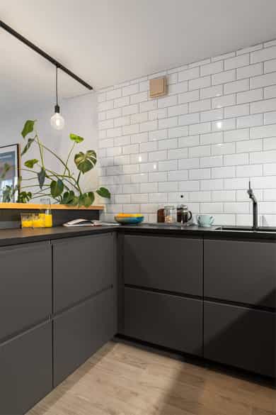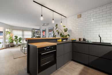 Innvendig Himlinger med malt betong. Vegger med malte plater, malt betong og malt panel. Gulv med laminat. Takhøyden ble entré til: 2,42 m. Det registreres enkelte bruksmerker i gulvoverflater, samt noe knirk i gulv på soverommet. Det vil normalt være noe bruksslitasje på overflatene i eldre boliger. Dette anses som mindre avvik. Entré Innbydende entré med plass til anheng av klær og sko. Dørcalling. Stue Åpen stueløsning med god plass til både sofagruppe og spisebord. Utgang til balkong på ca. 6 kvm. Kjøkken IKEA kjøkkeninnredning med glatte fronter. Laminat benkeplate med planlimt vaskekum. Fliser og belysning over deler av benkeplaten. Integrert platetopp, stekeovn, oppvaskmaskin og kjøl/fryseskap. Kullfilterventilator over kokeplass. Waterguard og komfyrvakt er montert. Bad Himling med malt betong. Vegger med malt betong. Gulv med belegg. Innredet med klosett, servant med innredning og dusjkabinett. Opplegg for vaskemaskin. Naturlig avtrekk. Soverom Stort soverom med god plass til dobbeltseng og garderobeskap.