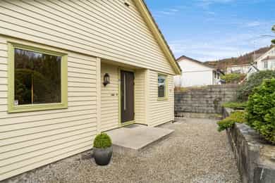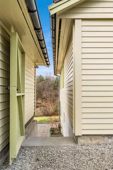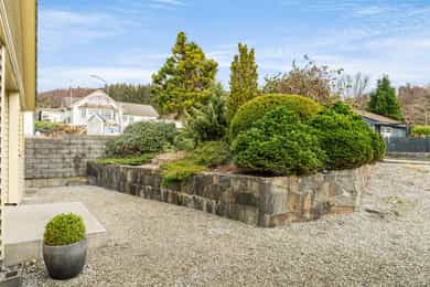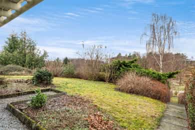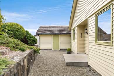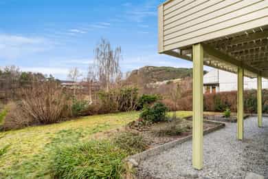 Gruset tun med gode parkeringsmuligheter og garasje.