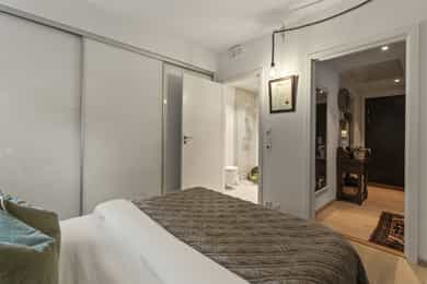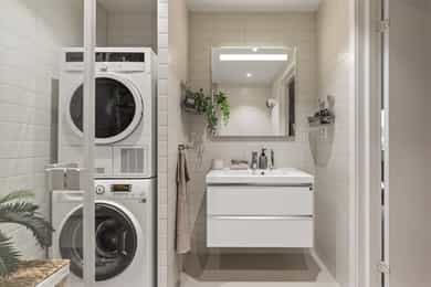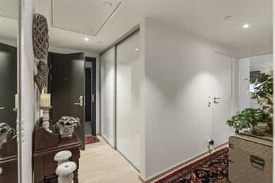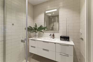 Entré Førsteinntrykket er en romslig entré der yttertøyet enkelt kan henges i en integrert skyvedørsgarderobe. Dørcalling som slipper inn for kjente og kjære. Stue Stuen er romslig, lys og luftig og har fleksible møbleringsmuligher. De store vinduene slipper inn masser av dagslys som gir et særpreg og luft til rommet. Det er utgang til stor balkong med kveldssol og en flott utsikt til bystranda, sjøen og Tønsberg Brygge. Kjøkken Kjøkkenet er i åpen løsning til stuen, noe som gjør dette til en sosial sone. Innredningen er moderne og delikat med slette hvite fronter. Alt av hvitevarer er integrert; kombinert kjøle- og fryseskap, platetopp, stekeovn, samt oppvaskmaskin. Kjøkkenventilator i overskap. Bad Badet er helflislagt med vegg- og gulvfliser. Elektriske varmekabler i gulv gir en lun varme året rundt. Badet er utstyrt med servantskap, samt overhengende speil med lys. Videre er det vegghengt toalett og dusjsone med inn- og utfeltbare dusjvegg. Det er også opplegg for vaskemaskin og tørketrommel. Bad - Soverom Badet tilknyttet hovedsoverommet og er helflislagt med vegg- og gulvfliser. Elektriske varmekabler i gulv. Badet er utstyrt med servantskap, samt overhengende speil med lys. Videre er det vegghengt toalett og dusjsone med inn- og utfeltbare dusjvegg. Soverom Det er 2 romslige soverom i leiligheten. På hovedsoverommet er det god plass til dobbeltseng og nattbord, samt en stor skyvedørsgarderobe. Soverom II er velegnet som barnerom, gjesterom eller kontor og er innredet med garderobeskap.