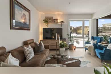 Kaldnes; Nyere og lekker leilighet m/bla 2 soverom og 2 bad | Stor balkong m/kveldsol og sjøutsikt |Heis og garasjeplass