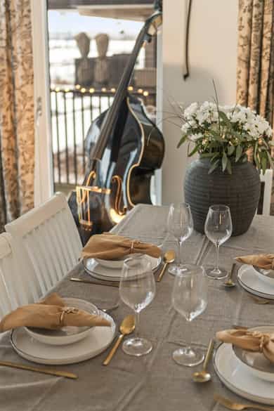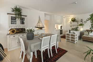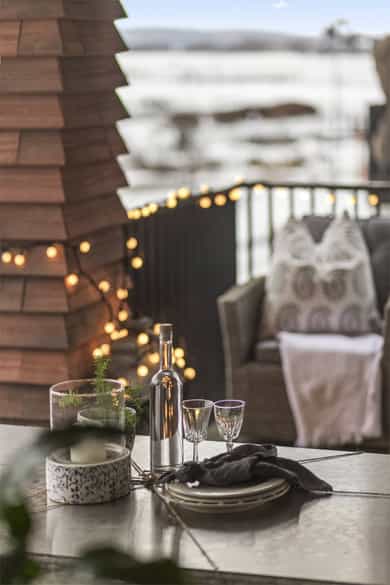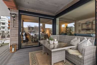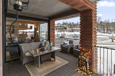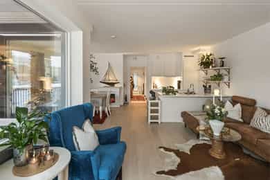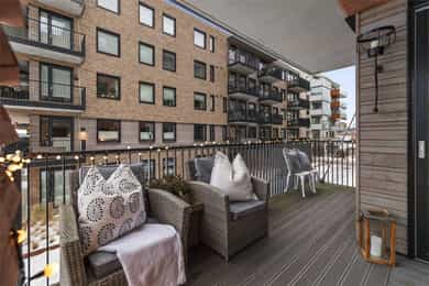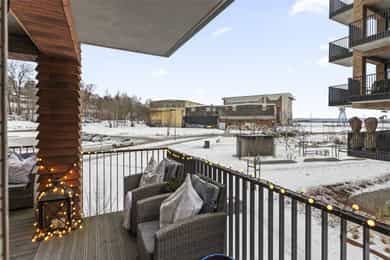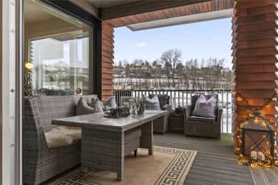 Leiligheten har en fin overbygd balkong hvor du kan nyte kveldssolen. Overbygget skjermer godt hvis været skulle være skiftende, og gjør det enkelt å la møblene stå ute året rundt. Bystranda og parken ligger rett utenfor leiligheten, og den nydelige utsikten strekker seg videre til sjøen og landskapet rundt – både fra balkongen og fra leilighetens store vindusflater.