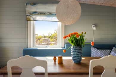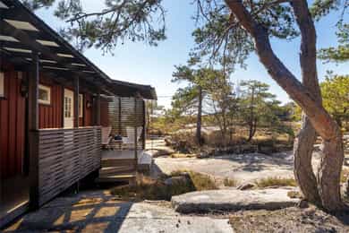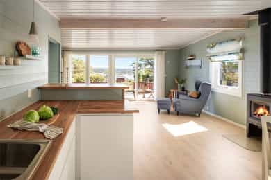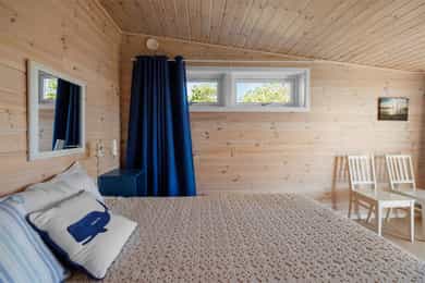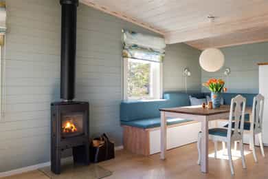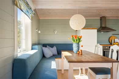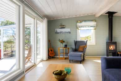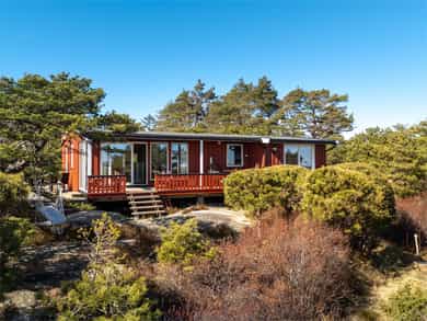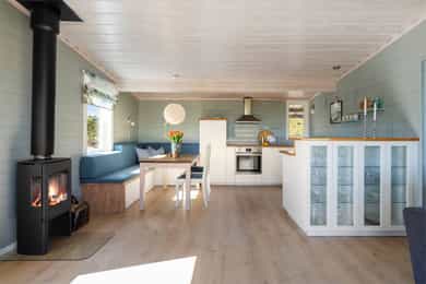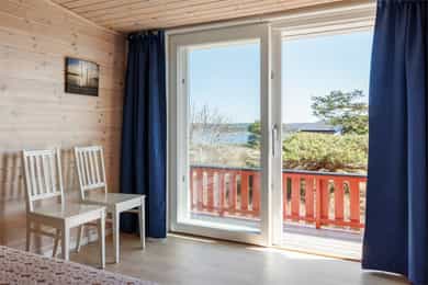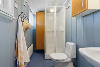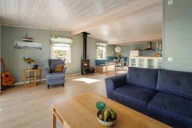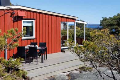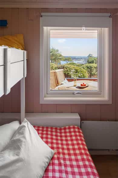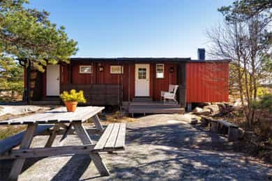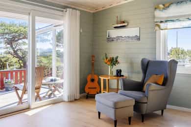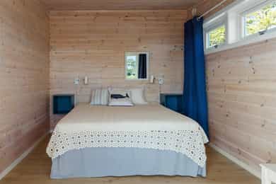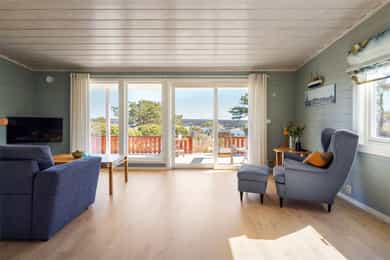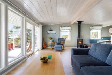 90 kvm helårshytte med båtplass | Solrikt, sjøutsikt, usjenert | 11 sengeplasser | Parkering