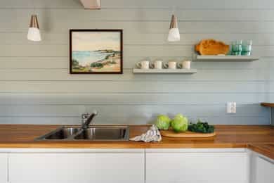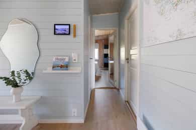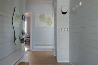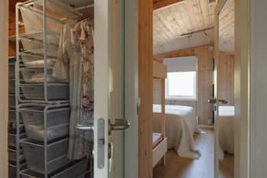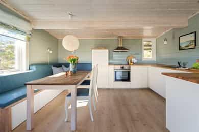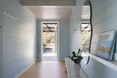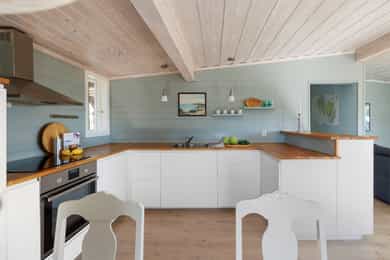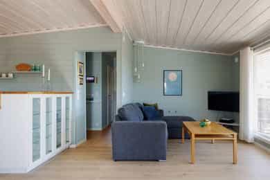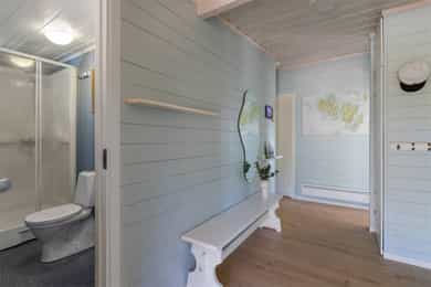Vegger: Malt trepanel Tak: Malt trepanel Gulv: Laminat og belegg på bad