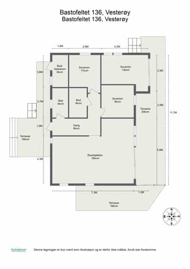 BRA-i: 73 kvm. Gang, stue/kjøkken, 3 soverom, bod og bad.