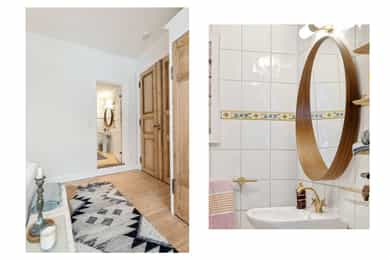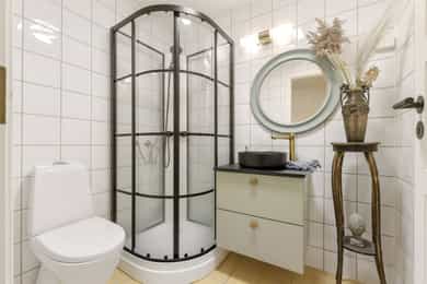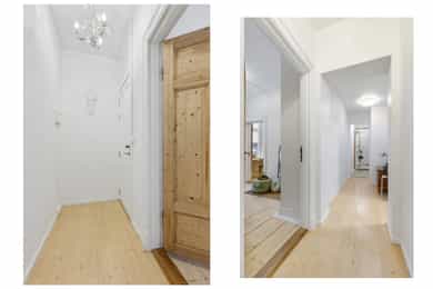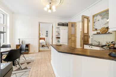 Entré: Velkommen inn! I leiligheten møtes du av en lys gang som gir et umiddelbart godt og riktig førsteinntrykk. Det er god plass til knagger og skohylle for oppbevaring av yttertøy. Gangen har en sentral plassering i leiligheten, som sikrer god flyt. Kjøkken: Leiligheten har en klassisk planløsning med stue, kjøkken og hovedsoverom på rad. Kjøkkeninnredning med hvite profilerte fronter, fliser på vegg over kjøkkenbenk og benkeplate i tre. Kum og ettgreps blandebatteri. Kjøkkenet er utstyrt med frittstående hvitevarer som komfyr med platetopp, oppvaskmaskin samt ventilator over kokesone. Det er kjøkkenventilator med antatt avtrekk ut. Det er rikelig med lagringsplass i benkeskap og hyller, i tillegg er det god plass til matlaging. Videre er det god plass til stort spisebord med hyggelig plassering ved vinduet. Stue: Herlig, lys og gjennomført hjørnestue med utsøkte detaljer. I stuen er det rikelig areal til sofagruppe med tilhørende sofabord og tv-møblement og spisebord. Rommet har generøs takhøyde på hele 3 meter og godt lysinnslipp via store vindusflater. Dette bidrar til en luftig og god romfølelse. Hjørnerom sikrer i tillegg godt lysinnslipp fra flere himmelretninger. Boligen ligger høyt og fritt med fint og frodig utsyn fra vinduene mot parken. Leiligheten ligger i en ærverdig bygård fra slutten av 1800-tallet, og de flotte, klassiske detaljene med rosett og nydelig stukkatur er godt bevart. Videre sikrer den nydelige prinsesseovnen behagelig varme, samtidig som den bidrar til hyggelig stemning på kalde høst- og vinterkvelder. Ifølge tidligere salgsoppgave ble det gjennomført rehabilitering av pipene i 2011. Rommet er åpent og romslig noe som gjør innredningsjobben enkel. Tre soverom: Leiligheten har tre gode og innbydende soverom. Hovedsoverommet har adkomst fra kjøkkenet via doble, originale fløydører. Rommet er stort, og har god plass til dobbeltseng, nattbord på hver side og garderobeskap. Soverommet er malt i en lys farge og store vindusflater sikrer godt med lys og luft. Det er hyggelig utsyn mot den idylliske parken på St. Hanshaugen. Fra hovedsoverommet er det adkomst til det ene badet i leiligheten. Badet har flislagte overflater, gulvvarme og opplegg for vaskemaskin. Badet inneholder dusjkabinett, toalett og servant med ett-greps blandebatteri. Soverom 2 og 3 har plass til seng, garderobeskap og skrivepult. Rommene fungerer perfekt som gjesterom, barnerom eller kontor. Det er adkomst til soverom 3 fra soverom 2. Soverommene vender mot bakgård. Separat toalett: Toalettrom med flislagt gulv og nylig malte veggflater. Utstyrt med gulvmontert toalett, servant med ettgreps blandebatteri og belysning. Bad 2: Flislagt bad med adkomst fra gangen. Badet inneholder dusjkabinett, gulvstående toalett og baderomsinnredning med skuffer, servant med ettgreps blandebatteri. Overflater: Gulv: Tregulv og fliser på badetne. Vegger: Malte vegger og flislagte vegger på badene. Himling: Malt himling. Takhøyden er oppmålt til ca. 3 meter.