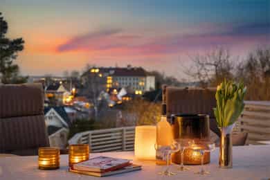 Sol fra tidlig morgen til sent på kveld, på ulike uteplasser Solen går ned ca. 20.00 midt på sommeren på hoved terrassen.