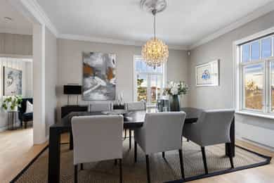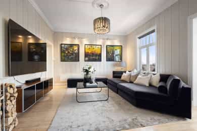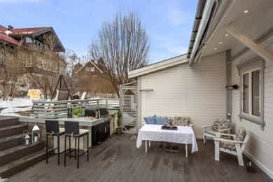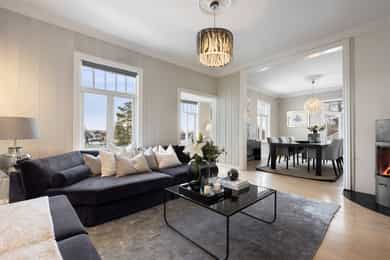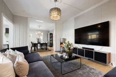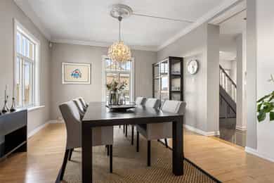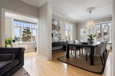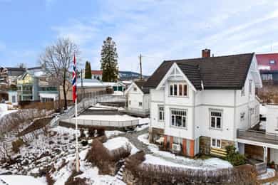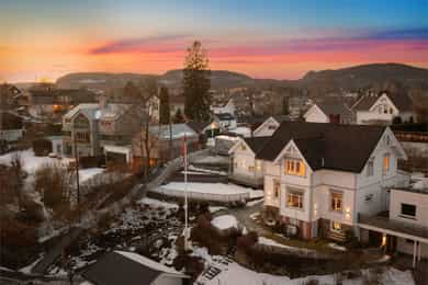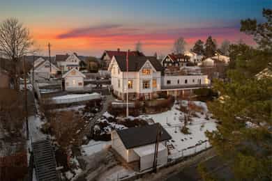 Velholdt og oppgradert sveitservilla over to plan med kjeller, dobbelgarasje og uthus – idyllisk beliggende på solrikt høydedrag sentralt på Bekkestua. Boligen kombinerer historisk sjarm med moderne standard og er betydelig oppgradert de senere år, med blant annet totalrehabilitert kjøkken (2021), lekkert flislagt bad (2019), oppgraderte elektriske anlegg med automatsikringer, rør-i-rør-system, varmepumpe og gulvvarme i flere rom. Eiendommen byr på fire soverom, to bad, romslige stue- og oppholdsrom med peisovn, samt gode lagringsmuligheter i kjeller og uthus. Tomten er pent opparbeidet med terrasser, utekjøkken, grillplass og flere solrike uteplasser med flott utsikt. Attraktiv og familievennlig beliggenhet med kort gangavstand til skoler, servicetilbud og offentlig kommunikasjon.