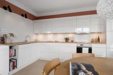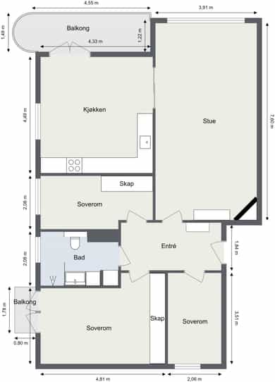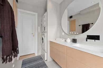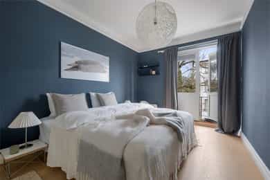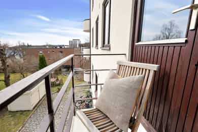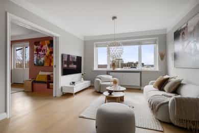Leiligheten ligger i byggets 2. etasje og inneholder; stue, kjøkken, 3 soverom, bad, entré, og 2 balkonger. Leiligheten disponerer også to eksterne boder på til sammen ca. 10 m². Det medfølger en garasjeplass med automatisk garasjeport og elbil-lader i felles garasjerekke. Stue/kjøkken Leiligheten har en meget praktisk og innholdsrik planløsning med delvis adskilt stue og kjøkken. Stuen har store vindusflater, og har god plass til sofagruppe, mediemøblement samt stuebord. Fra vinduene er det flotte siktlinjer. I stuen er det en peis som skaper hygge og bidrar med varme på kjølige dager. Flott kjøkken fra den danske kjøkkenprodusenten Kvik med hvite slette fronter. Det er fliser på vegg over benkeskap og heltre benkeplate med nedfelt kum i rustfritt stål. Kjøkkenet har godt med skap- og benkeplass. Det er også god plass til spisebord – perfekt for familiesamlinger og hyggelige middager med venner. Fra kjøkkenet er det videre adkomst til en syd-vestvendt balkong på 8 m² med god plass til møblement, grill og beplantning. Det er flott og fritt utsyn mot Skøyen-skyline og Ullernåsen. Soverom Leiligheten har tre soverom. Hovedsoverommet har god plass til dobbeltseng med tilhørende nattbord samt godt med oppbevaringsplass i stor garderobe. Fra hovedsoverommet er det videre adkomst til en hyggelig østvendt balkong med morgensol. Soverom nr. 2 og 3 egner seg ypperlig som gjesterom, barnerom eller kontor. Bad Leiligheten har et lyst flislagt bad med varme i gulv og downlights i himling. Badet ble rehabilitert i 2019 og har baderomsinnredning bestående av benkeskap og veggskap med lekre eikefinerfronter samt servant i helstøpt plate. Det er speil og belysning over servant, regnfallsdusj med garnityr for dusj og servant innebygget i veggen samt sidefelt i herdet glass, og veggfestet klosett med innebygget sisterne. Badet har opplegg for vaskemaskin og tørketrommel. Entré Leiligheten har en lys og innbydende entré, med en lekker plassbygget sittebenk, knaggrekke og skoskap. Entréen er koblet til calling anlegg som gjør det enkelt å slippe inn gjester.