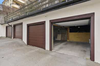 Det medfølger 1 garasjeplass med automatisk garasjeport og elbil-lader. Garasjen ligger midt i rekken av garasjer som gjør inn- og utkjøring relativt enkelt sommer som vinter. I tillegg har sameiet 2 gjesteparkeringsplasser på tunet, og også plass til ytterligere en bil under luftebalkongene for korttidsparkering ved behov. Rask av- og påstigning kan skje foran inngangsdøren. Garasjene i rekken ble oppgradert med nye garasjeporter og automatisk åpner i 2019. Garasjen er lagt til seksjonen som en tilleggsdel i henhold til reseksjonering tinglyst 16.02.2015. Selger har en Audi Q4 som fint får plass i garasjen. Ladestrømutgifter avregnes to ganger pr år og faktureres den enkelte el-bileier sammen med innkrevingen av fellesutgiftene (OBOS).