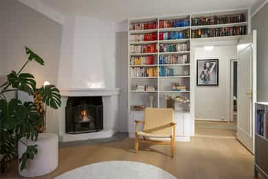 2011: Plassbygde bokhyller og benk i inngangsparti i funkis-stil