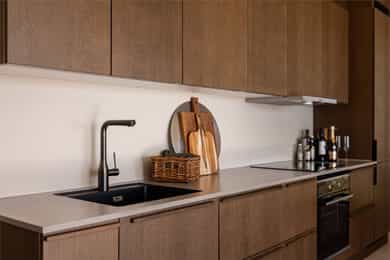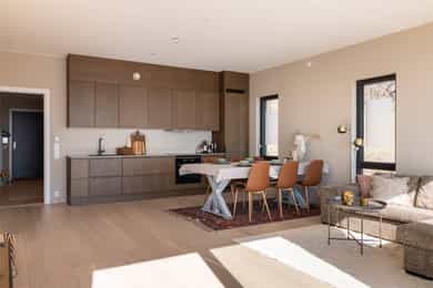 Kjøkken av merke Sigdal og er innredet med: Glatte fronter, nedsenk dobbel vask med ett greps blandebatteri, laminert benkeplate, kokeplate, komfyrvakt, vannstoppersystem og mekanisk avtrekksvifte. Bad/wc ved entre/gang er innredet med: Enkel vask med et greps blandebatteri og underskap/overskap med speil, vegghent wc, nedsenk dusjhjørne med glassvegg. Varmekabler i gulv. Bad/wc ved soverom 1 er innredet med: Enkel vask med et greps blandebatteri og underskap, overskap med speil, vegghent wc, nedsenk dusjhjørne med svingbar glass dører og opplegg for vaskemaskin. Varmekabler i gulv. Innvendige overflater: Tak: - Malte plater/etasje skille. Vegger: - Malte plater, fliser på bad. Gulv. - Laminat og fliser på baderom.