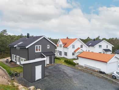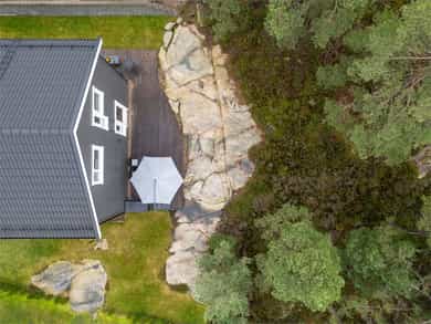 Du kjører inn på en stor, gruset gårdsplass. En fin bod møter deg ved gårdsplassen, utmerket til lagring av hage redskaper, båtvester og padleårer. Denne frittliggende familieboligen ble ferdigstilt i 2019 og ligger i ytterkanten av et attraktivt, boligområde på Asmaløy. Fra de siviliserte gatene og husene er kontrasten voldsom bak huset, der naturen åpner seg med furutrær, svaberg og lyng. Det er som om vi befinner oss på grensen til villmarken, og dette er faktisk et LNF-område.