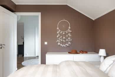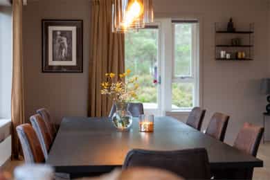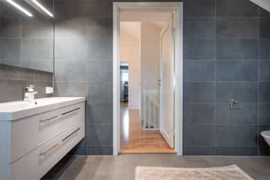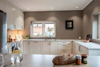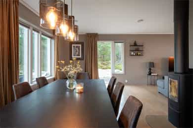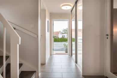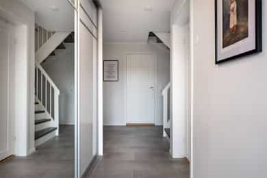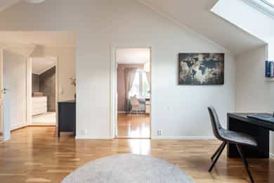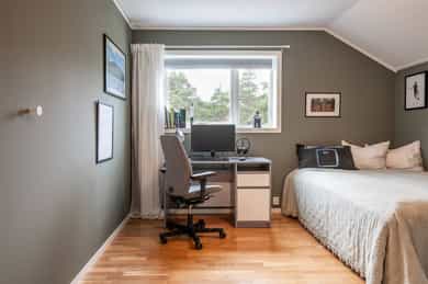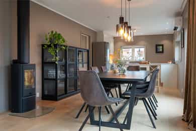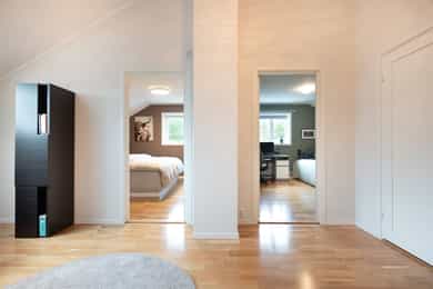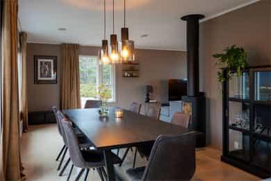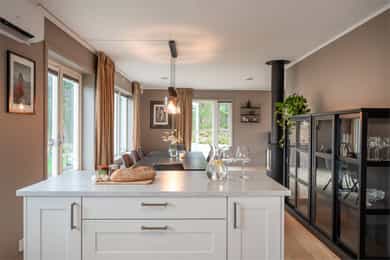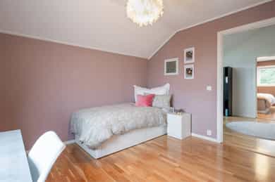 Du henger fra deg i skyvedørsgarderoben. Gangen er flislagt, og du kjenner på en god romfølelse, før du fortsetter inn til stuene og kjøkkenet. Disse ligger samlet og strekker seg gjennomgående i hele boligens lengde, for så å svinge inn i dagligstuen. Veggene åpnes opp med vinduer i fire retninger. Dette skaper god kontakt med uteplassene, og slipper både lys og natur inn i rommene. Spisestuen har doble dører ut til den ene delen av terrassen, mens dagligstuen har utgang til den andre. Flater og koloritt gir en tidløs følelse. Rommene utstråler kvalitet. Mellombrune vegger klinger harmonisk mot hvitt tak. Stuegulvet flyter helhetlig med en vakker, bred eikeparkett med varmekabler under. Til ytterligere oppvarming finner vi en moderne pidestallovn og en vegghengt varmepumpe fra 2023. Ventilasjonen er balansert, og inneklimaet er godt. Kjøkkeninnredningen fra Sigdal fyller tre vegger, med hvite enkle fyllingsprofiler, og rommet får godt med lys fra to kanter. Hvitevarene er integrerte bortsett fra kjøleskapet. Siste tilskudd er kjøkkenøyen som danner et fint skille mot spisestuen og fungerer som en mellomstasjon for matservering. Første etasjes badeværelse holder en ren og behagelig standard med grå gulvfliser, hvite vegger og tak og mosaikk i dusjesonen. Her er innredningen godt planlagt, så vaskemaskin og trommel blir integrerte deler ved siden av servanten. Tar vi trappen opp, legger vi først merke til den åpne himlingen, som gir en suveren takhøyde - 3,85 meter på det høyeste. Loftstuen kan benyttes som kontor eller leseplass. De to takvinduene som henger sammen med veggvinduene er et uvant grep, som bør benyttes oftere, for det er kjempeflott. Her oppe finner du baderom nummer to. Vegger og gulv bærer grå fliser, tøft og naturlig. Her ser vi mosaikk og sluk i to hjørner, så det er lagt opp til både dusjesone og badekar, men man har foreløpig valgt å sette inn et praktisk dusjkabinett. Du finner tre nydelige soverom her, med hver sin farge og identitet - alle like store. Himlingen er i normal høyde med lett skrå takvinkler langs ytterkantene. Ett av rommene har en spennende vindusløsning som tilfører det lille ekstra. Summen av planløsning, kvalitet og utforming, gjør dette til en virkelig fin familiebolig. Skulle behovet være der for ett fjerde soverom, kan man ved å sette opp en lettvegg i dagligstuen få til dette med enkle grep.