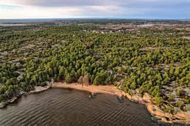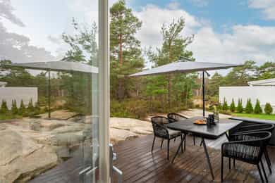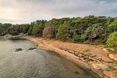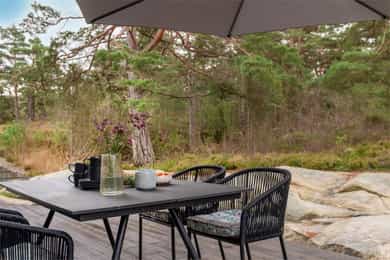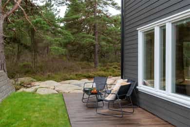 Langs husveggene er det opparbeidet en jevn gressplen, og på baksiden foran de sørøstre og sørvestre veggene har man etablert en stor, fin platting med plass til ulike møblementer. Her skuer du rett over svabergene og inn i en magisk furuskog. Solforholdene er gode, og vissheten om at du kan spasere rett inn i skogen og kun bruke 7 min ned til øyas kanskje beste badestrand, er noe for seg selv.