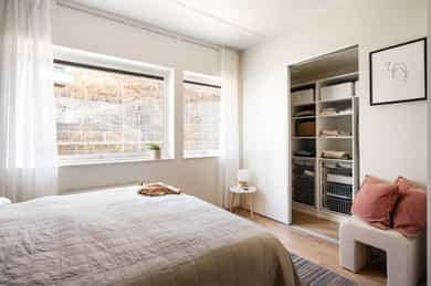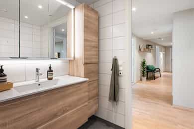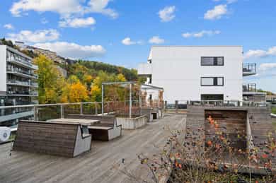 Stue: Lys og luftig stue med store vindusflater som gir rikelig med naturlig lys. Herfra er det direkte utgang til en herlig balkong. Stuen fremstår romslig og har god plass til sofagruppe med tilhørende møbler, samt spisebord for hyggelige sammenkomster. Balkong: Fra stuen er det utgang til en romslig, nordvendt balkong på ca. 11 kvm, som oppleves som en naturlig forlengelse av oppholdsrommet. Balkongen har god plass til utemøbler og vender mot rolig blindvei. Den er oppført i betong med terrassebord på gulv, og har rekkverk i aluminium og glass. Balkongen er også utstyrt med strømuttak og utebelysning. Rekkverkshøyden er ca. 1,28 m, og høydeforskjellen ned til terreng er ca. 3 m. Kjøkken: Kjøkkenet ligger i åpen løsning mot stuen og bidrar til en luftig og sosial planløsning. Innredningen er moderne og fra 2019, med gode arbeidsflater og rikelig med skapplass. Kjøkkenet har slette, lakkerte fronter, benkeplate i kvarts, underlimt oppvaskkum i rustfritt stål og ventilator med kullfilter. Det er integrerte hvitevarer bestående av stekeovn, induksjonstopp, oppvaskmaskin og kombinert kjøle- og fryseskap (side-by-side). Hovedbad: Lyst og moderne baderom fra byggeår. Badet er innredet med baderomsmøbel (oppgradert i 2024), vegghengt speil med belysning, dusjhjørne med innfellbare glassvegger, vegghengt toalett og opplegg for vaskemaskin. Flislagt gulv med varme, flislagte vegger og malt himling med downlights. Bad 2: Tidsriktig baderom fra byggeår med dusjhjørne med innfellbare glassvegger, vegghengt toalett, servant samt overskap med speildør og belysning. Badet har flislagt gulv med varme, flislagte vegger og malt himling med downlights. Soverom: Leiligheten har tre romslige soverom. Hovedsoverommet har god plass til dobbeltseng, nattbord, kommode og eventuelt kontorpult. Herfra er det også direkte adkomst til en praktisk bod/walk-in closet med gode oppbevaringsmuligheter. De to øvrige soverommene egner seg godt som gjesterom, barnerom eller kontor, og har plass til seng, nattbord, garderobeskap og kommode. Entré: Romslig og innbydende entré med god plass til oppheng av yttertøy og oppbevaring av sko. En praktisk garderobe gir rikelig med lagringsplass. Fra entréen er det også adkomst til en praktisk bod. Dørtelefon er plassert ved inngangsdøren. Tilstandsrapport for boligen er vedlagt salgsoppgaven. Se denne for nærmere informasjon om tilstandsgrad.