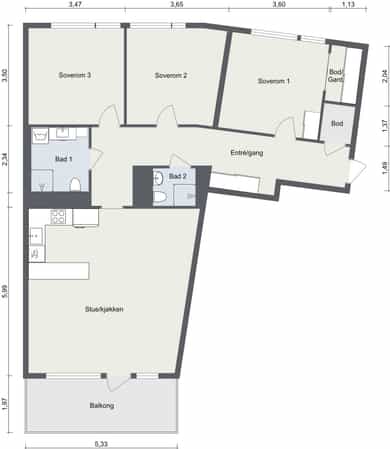 BRA-i: 106 kvm. Stue/kjøkken, tre soverom, bad 1, bad 2, entré og bod