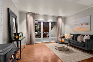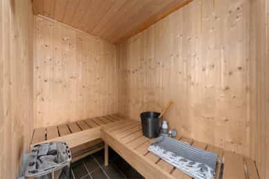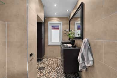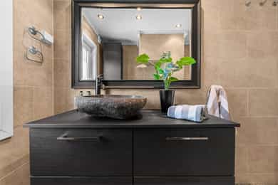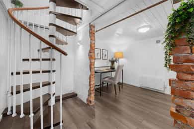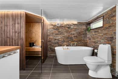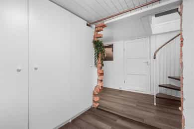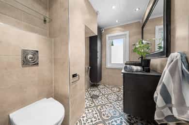 Kort fortalt: - Velholdt 4-roms over to plan. - Leiligheten fornyet i 2015 - 21. - Usjenert i et hyggelig nabolag. - Garasje og mulighet for å lade elbil i brl. - Herlig terrasse på ca. 48 kvm. - Leiligheten disponerer stor hage - Stue og kjøkken i åpen løsning. - Kjøkken m/innebygd sittebenk. - Godt med skap- og benkeplass. - Alle hvitevarene er integrerte. - Innbydende stue med peisovn. - To bad/wc i hver sin etasje. - Begge utstyrt med gulvvarme. - Elegant badekar på kjellerbadet. - Kjellerbadet har egen badstu. - Opplegg for vaskemaskin nede. - Tre gode soverom med skap. - Garderobeplassen godt ivaretatt. - Romslig utebod under terrassen og kjellerbod. Entré Velkommen inn i en velholdt leilighet med god fleksibilitet, utmerket for både ny- og veletablerte. Leiligheten ligger i 1. etasje, med adkomst via en felles trappegang. Inngangsdøren har kodelås, og i yttergangen passer det fint å innrede med hyller eller knagger. Vel inne er entreen innredet med downlights, laminatgulv og gråmalte vegger. Mellom etasjene har leiligheten en vindeltrapp, og i kjellergangen er innslag av synlig teglstein bevart for et stilig særpreg. I gangen står det et stort garderobeskap med hvite fronter. Stue Sammen med kjøkkenet utgjør stuen et åpent, sosialt og innbydende oppholdsrom med klart avdelte soner. Rommet har fint gjennomlys, og vinduene inkluderer en glassdør til den store terrassen. Om sommeren er det deilig å trekke ut for både avslapning og middager i varmen. Dagslyset suppleres fint av downlights i deler av himlingen, og parkett på gulvet kombineres med vegger malt i en dus og delikat gråtone. Lune kvelder sikres av en peisovn, og nærmest kjøkkenet passer det utmerket å innrede med spisebord. Kjøkken Kjøkkenet er oppført i en smart u-form med god skapplass, fine arbeidsflater og barløsning mot stuen. Under vinduet er det en koselig sittebenk med skuffer, og med platetoppen integrert ved baren er kjøkkenet tilrettelagt for sosial matlaging. Innredningen har et klassisk uttrykk med hvite, profilerte fronter, vitrineskap, nedfelt oppvaskkum og benkeplate av laminat. Over benken er det mørke mosaikkfliser, og over kokesonen har kjøkkenet en ventilator med avtrekk. Downlights i taket tilfører ekstra lys til arbeidsflatene. I tillegg til platetoppen er stekeovn, oppvaskmaskin og en kombinert kjøl/frys integrert i innredningen. Bad/wc/vaskerom Leiligheten har en praktisk planløsning med bad i begge etasjer. Oppe er badet innredet med mønstrede gulvfliser og store veggfliser i en dus jordtone. Varme er lagt i gulvet, og badet har downlights, åpent dusjhjørne og vegghengt toalett. Baderomsinnredningen består av en sort skuffeseksjon med elegant speil, toppmontert servantsål og et tilhørende høyskap i samme stil. Skapene gir god plass til oppbevaring av håndklær og hygieneartikler. Bad 2 Badet nede har både en egen badstue, et dusjhjørne med innfellbare glassdører og et frittstående badekar i elegant design. På gulvet er det mørke fliser med varme, mens veggene er kledd med grå våtromsplater, beiset trepanel og dekorfliser som ligner teglstein. Flisene bidrar til et unikt uttrykk, og badet har toalett og skjult belysning i taket. Et speil med integrert belysning er plassert over en hvit skapseksjon med stor benkeplate og toppmontert servantskål. Under benken har badet opplegg for vaskemaskin og plass til tørketrommel. Badstuen er innredet med flislagt gulv og plassbygde trebenker. Soverom og garderobe I leiligheten er tre gode soverom fordelt med ett i kjelleren og to i 1. etasje. Oppe har hovedsoverommet plass til dobbeltseng, og det er både et garderobeskap og en hylleløsning med stang for oppheng. Også det andre rommet i etasjen har god møbleringsfrihet, og det er mye oppbevaring i et dobbelt skap med speil på to av dørene. Langs den ene veggen har soverommet i kjelleren en stor, plassbygd skyvedørsgarderobe med dels speilfronter. Soverommet nede har og vært brukt som både soverom og kjellerstue. Ekstra lagringsplass finnes i en romslig kjellerbod og i en utvendig bod under terrassen.