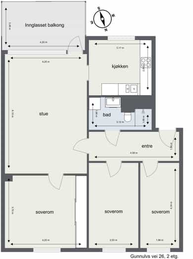 Leiligheten ligger i 2.etasje og inneholder entrè, bad, 3 soverom, stue, kjøkken og en innglasset balkong på 11m². Leiligheten disponerer også 2 boder i kjeller på ca. 3,8 m² og 2,02 m². Det gjøres særskilt oppmerksom på at bod som er medtatt som BRA-e og i totalt BRA ligger på fellesareal, men disponeres av denne leiligheten.