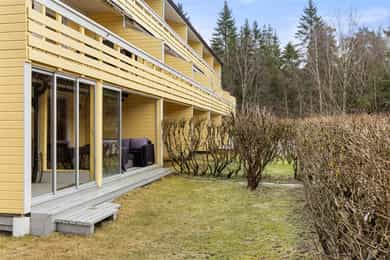 Boligen har pent opparbeidet hagedel med plenarealer og beplantning. Hver av boligene benytter naturligområde utenfor egen bolig. Det er plantet hekk mellom seksjonene.