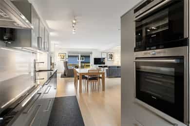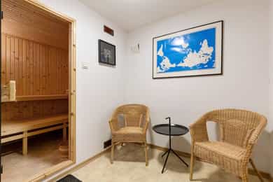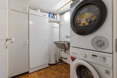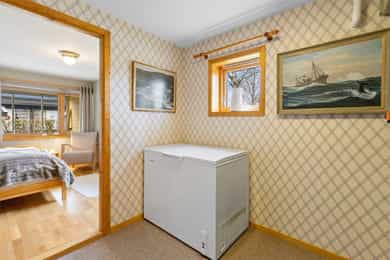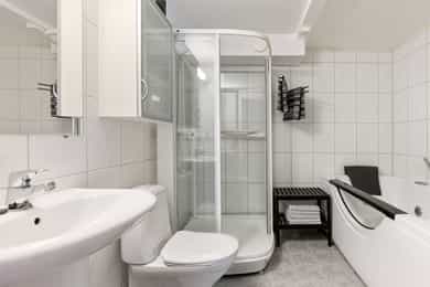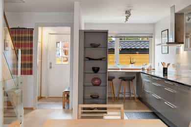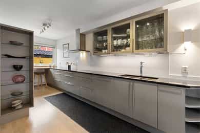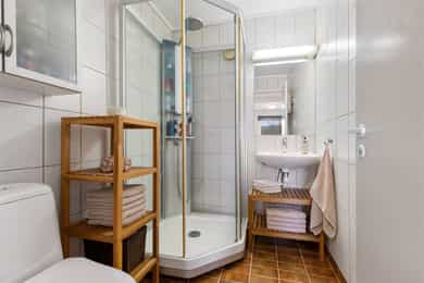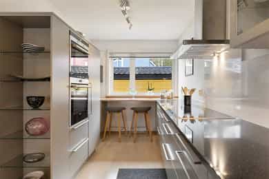 Kjøkken: HTH kjøkkeninnredning fra 2013. Kjøkkeninnredning med glatte fronter. Enkelte glassfronter i overskap. Veggplater i granitt over benkeplate (samme type granitt som benkeplate). Heltre benkeplate mot vinduet. Benkeplate i granitt med underlimt kum i rustfritt stål. Ventilator. Platetopp, stekeovn, dampovn, oppvaskmaskin, mikrobølgeovn og kjøleskap er integrert i innredningen. Komfyrvakt er montert. Bad, underetasje: Badet er ifølge eier pusset opp i 2007. Dokumentasjon på utførelse er ikke fremvist. Boblebadekaret er installert i 2021. Badet har veggskap og høyskap med frostet glassfronter. Speil over servanten. Dusjkabinett, boblebadekar, servant og klosett. Gulv har fliser på betong. Sluk i plast. Flislagte overflater på vegger. Hulltaking ble ikke utført da treverk var tilgjengelig i åpning mellom badet og vaskerommet. Det ble benyttet fuktmåler med "pigger i treverk" i veggens bunnsvill, og det ble ikke påvist fukt utover normale verdier. Følgende er gitt tilstandgrad 2: - Tg 2 er gitt på grunn av alder sett i forhold til forventet levetid på vanntett sjikt. Nevnte forhold medfører økt risiko for lekkasjer som kan føre til fuktproblematikk i konstruksjonen. - Vegger i våtrom skal ha vanntett sjikt (membran) i våte soner. Denne typen konstruksjon har ifølge Sintef Byggforsk normalt levetid på ca. 15-20 år og tilstandsvurdering er derfor basert på alder, da konstruksjonen har oppnådd mer enn halvparten av forventet levetid. Dette medfører en økt risiko for lekkasjer. Bad, 2. etasje: Badet er ifølge eier pusset opp i 1989, det ble da lagt membran på gulv og vegger, fliser, sanitærutstyr, innredning og elektriker- og rørleggerarbeider. Sluket er fra byggeåret. Fakturaer er fremvist. Dokumentasjon på utførelse er ikke fremvist. Badet har veggskap med frostet glassfronter. Dusjkabinett, servant og klosett. Våtromsgulv: Fliser på betong. Sluk i plast. Våtromsvegger: Flislagte overflater. Det ble borret et 73 mm. hull i badets tilstøtende vegg fra skap i soverom mot dusjsone. Det ble benyttet fuktmåler med "pigger i treverk" i veggens bunnsvill, og det ble ikke påvist fukt utover normale verdier. Hullet er sikret etter hulltaking med et plastlokk. Følgende er gitt tilstandsgrad 2: - Det er registrert hull etter eldre innredning og riss/hakk i flere gulvflis. - Eldre sluk av plast er ofte utsatt for lekkasjer og særlig i overganger. Eventuelle lekkasjer kan medføre fuktskader på tilliggende konstruksjoner. - Det vanntette sjiktet har oppnådd en alder som øker risikoen for skader/følgeskader. - Det er satt inn dusjkabinett, og vann renner fra dusjkabinett og direkte ned i sluk. En slik løsning kan forhindre fuktskade, men gir ingen erstatning for tettesjikt/membran. Manglende oppgradering av våtrommet medfører høy risiko for at konstruksjonene ikke vil tåle vanlig bruk av vann eller lekkasjer. Dette kan føre til fuktskader på tilstøtende konstruksjoner. - TG 2 er gitt på grunn av nevnte forhold. - Tg 2 er gitt på grunn av alder i forhold til forventet levetid og bruksslitasje. Vaskerom: Vaskerommet er opprinnelig fra byggeåret. Dokumentasjon på utførelse er ikke fremvist. Fliser på gulvet er skiftet i 1989. Faktura er fremvist. Vaskerom har høyskap med glatte fronter. Skyllekum i rustfritt stål og opplegg for vaskemaskin. Gulv har fliser på betong. Sparklet og malte plater med flislagt oppkant på vegger. Hulltaking ble ikke utført da treverk var tilgjengelig i åpning mellom badet og vaskerommet. Det ble benyttet fuktmåler med "pigger i treverk" i veggens bunnsvill, og det ble ikke påvist fukt utover normale verdier. Følgende er gitt tilstandgrad 2: - Det er ikke sluk rommet som er et krav i vaskerom, men det er etablert åpning med fall mot sluket plassert på badet. - Det er funnet bom under enkelte fliser. Årsaken til bom kan være at det ikke er oppnådd full limdekning, og/eller bruksbelastning. Mindre områder med bom i fliser utløser ingen store skader så lenge større deler av flisen har god limdekning. I dette tilfellet er det registrert bom i et lite område. Forholdet kan endres over tid og området bør kontrolleres med tiden. Det er registrert enkelte riss/hakk i fliser. - Eldre våtromskonstruksjoner er en risiko i forbindelse med fuktproblematikk, da det er ukjent hvordan konstruksjonen og tettesjikt er oppbygget. Da dette er et vaskerom med lite eksponering av vann mot overflater, er det gitt TG 2 og ikke 3. - Vaskerom ligger under kategorien våtrom. I våtrom er det krav til fukttett sjikt på hele gulvet, 5 cm opp fra gulv på alle vegger og i våte soner. Våte soner i våtrom er rundt dusj og servant. I dette tilfellet er det ikke laget fukttett sjikt i våtsone rundt utslagskum. Da dette er et vaskerom med lite eksponering av vann direkte mot veggoverflater er det ikke gitt TG 2 og ikke 3. - Tg 2 er gitt på grunn av alder i forhold til forventet levetid og bruksslitasje. Overflater på innvendige gulv: Underetasje: Innvendige gulv er belagt med trestavs parkett, gulvbelegg og fliser. Sprukket fliser i trapperommet ved døråpningen mot kjellerstuen. 1. etasje: Innvendige gulv er belagt med trestavs parkett og fliser. 2. etasje: Innvendige gulv er belagt med trestavs parkett og gulvbelegg. Overflater på innvendige vegger: Underetasje: Malt panel. Panel. Malt glassfiberstrie. Tapet. Sparklet/pusset og malte overflater. 1. etasje: Malt glassfiberstrie. 2. etasje: Malt glassfiberstrie. Overflater på innvendig himling: Underetasje: Panel i badstue. Ubehandlet plater i boden. Sparklet og malte plater for øvrig. Himlingshøyde ca. 2,16 m målt i kjellerstue. 1. etasje: Sparklet og malte plater. Himlingshøyde ca. 2,37 m målt i stue. 2. etasje: Sparklet og malte plater. Himlingshøyde ca. 2,40 m målt i trapperommet. Rom under terreng: Boden har pusset og malte overflater på innside av yttervegger mot terreng. Det forutsettes at overflater på innside av grunnmuren er behandlet med diffusjon