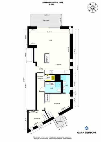 2. etasje: Stue, kjøkken, 2 soverom, 2 bad, entre og bod. Terrasse/balkong (TBA): Adgang til 9 kvm vestvendt balkong fra stuen, og 2 kvm østvendt balkong fra soverom. Interne boder: ca 1 kvm lagringsplass i bod ved entré. Eksterne boder: Kjellerbod på 8 kvm i fellesareal. Takhøyde: Takhøyden er målt til 274 cm i stuen. Det gjøres særskilt oppmerksom på at bod som er medtatt som BRA-e og i totalt BRA ligger på fellesareal, men disponeres av denne leiligheten.