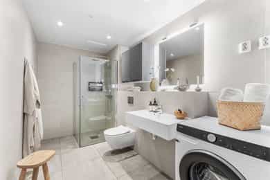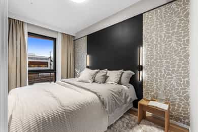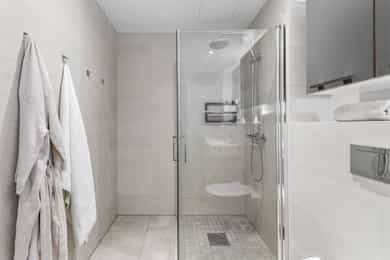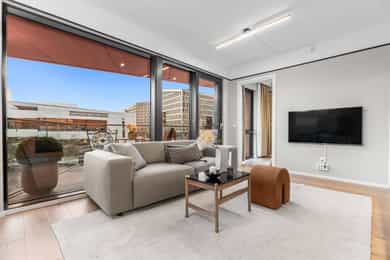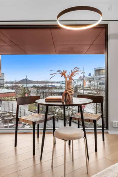 Entré Velkommen inn! Du ønskes velkommen av en innbydende og romslig entré med god plass til garderobeløsninger, kommode eller knaggrekke. Her får du et svært godt førsteinntrykk av boligen - lys, luftig og velholdt. Fra entré er det en stor og praktisk innebod, som enkelt kan gjøres om til walk-in closet. Inneboden/walk-in bidrar til en ryddig og oversiktlig bolig. Stue | Kjøkken Den åpne stue-/kjøkkenløsningen gir en sosial og behagelig romfølelse, med god plass til både sofagruppe og spiseplass. Store vindusflater slipper inn rikelig med dagslys og gir flott utsikt mot fjorden og kanalen. Solskjerming er montert på kjøkken og store vinduet mot balkongen for optimal komfort. Med en takhøyde på 2,56 meter og eikeparkett på gulv fremstår rommet både moderne og innbydende. Boligen vender mot sørvest og byr på svært gode solforhold fra ca. kl. 14 og utover ettermiddagen - helt til solen forsvinner bak Operaen på kvelden. Fra stuen er det utgang til en overbygget og skjermet balkong på ca. 8 m² med trespaltet gulv. Her er det god plass til utemøbler og grill, og solen følger deg store deler av dagen. Nyt utsikten mot fjorden og det ikoniske Munchmuseet - her bor du sjønært, midt i hjertet av Oslo. Moderne kjøkkeninnredning fra byggeår med slette fronter og laminert benkeplate med underlimt vask og ettgreps blandebatteri. Integrert kjøl/frys, oppvaskmaskin, ovn, induksjonstopp og mekanisk avtrekk via ventilator. Komfyrvakt er installert. Det opplyses om en mindre sprekk på siden av platetoppen - denne fungerer ellers som normalt. Soverom Boligen har to gode soverom. Hovedsoverommet er romslig med plass til dobbeltseng, nattbord og garderobeskap. Soverom II passer perfekt som barnerom, gjesterom eller hjemmekontor - avhengig av behov. Bad Flott og tidløst bad med moderne fliser og vannbåren gulvvarme. Badet er utstyrt med heldekkende servant, speil med belysning, vegghengt toalett og dusj med herdet glassdører. Det er opplegg for vaskemaskin og tørketrommel, samt balansert ventilasjon for et godt inneklima. Bod Til boligen følger en romslig kjellerbod på ca. 6 m² - ideell for oppbevaring av sesongutstyr og andre eiendeler du ønsker å ha lett tilgjengelig, men ute av syne.
