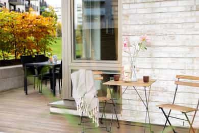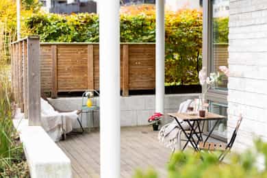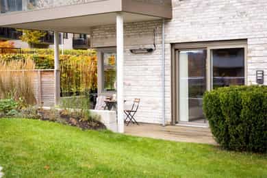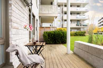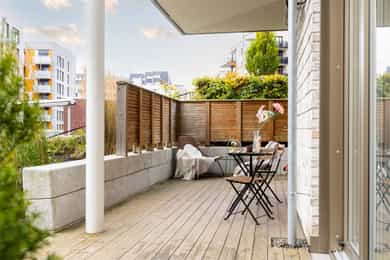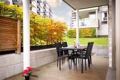 En vestvendt markterrasse av trekonstruksjoner på ca. 26 m². - Markterrassen er oppført i trekonstruksjon. Deler av bjelkelag og terrassebord er i direkte kontakt med gress/terreng. Dette gir risiko for fuktopptak, råte og redusert levetid på materialene. Boligblokk bygget i 2020. Bygningen antas fundamentert med stål-/betongpilarer til stedlige masser. Støpt plate til pelehoder. Grunnmur av betong. Etasjeskillere av betong/prefabrikerte betongelementer. Yttervegger oppført av betong, forblendet med murstein. Flat takkonstruksjon antatt tekket med asfalttakbelegg/takfolie (ikke besiktiget).